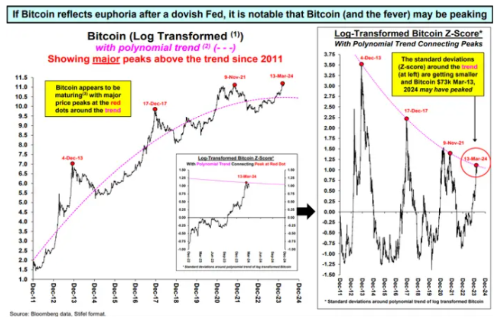 Stifel股票策略师Barry Bannister在一份报告中表示,比特币的飙升与美联储的鸽派转向同时发生,这种联系可能预示着当前牛市的结束,比特币价格即将见顶。