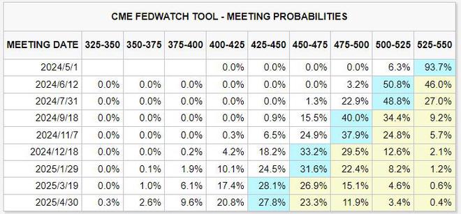 高于预期的CPI数据释出后,据芝商所FedWatch工具显示,目前市场对于美国在6月降息的预期已经从此前的56.1%大幅下降至20.6%,认为美联储在6月继续保持按兵不动的概率也从此前的42.6%上升至79%。