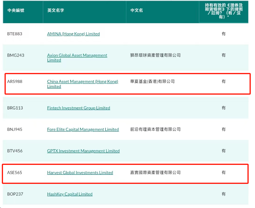 4月10日,香港证监会于凌晨在官网更新了虚拟资产管理的基金公司名单,新增了嘉实国际和华夏基金(香港),这两家公募基金在原有的传统资产管理业务上,新增了虚拟资产管理业务。而这也是中国头部基金公司香港子公司首次获批虚拟资产资管服务。