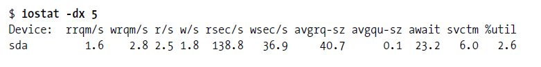 常见 linux 的磁盘 IO 指标的缩写习惯:rq 是 request,r 是 read,w 是 write,qu 是 queue,sz 是 size,a 是verage,tm 是 time,svc 是 service。