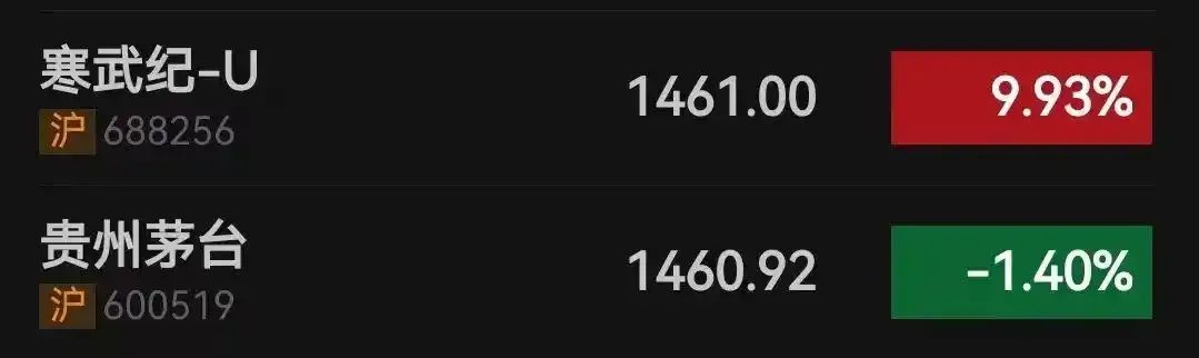 北京时间8月27日下午,寒武纪(688256.SH)股价延续强势表现,盘中拉升上涨近10%,股价一度达到1462元,超越贵州茅台。