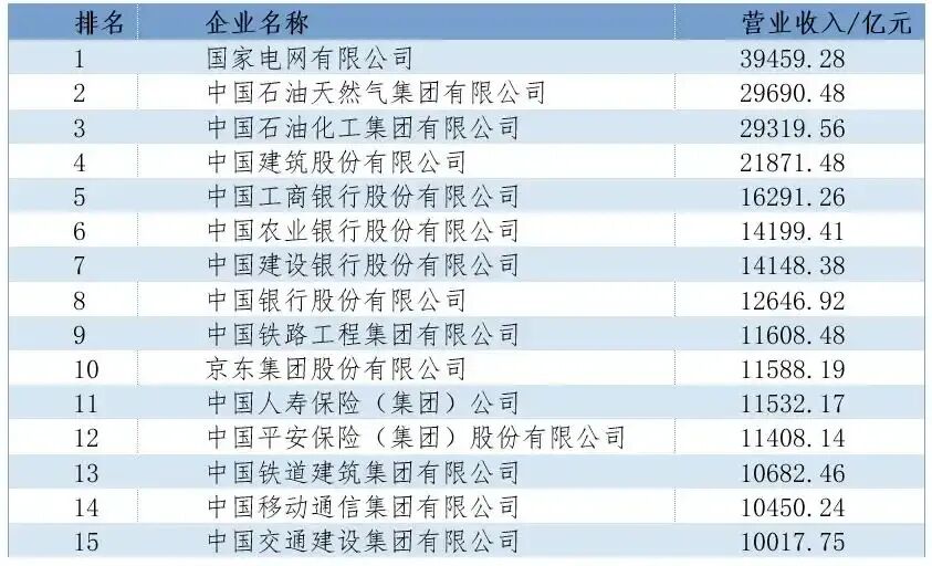 国家电网营业收入超过3万亿元,即将突破4万亿元大关;中国石油、中国石化、中国建筑的营业收入均超过2万亿元。