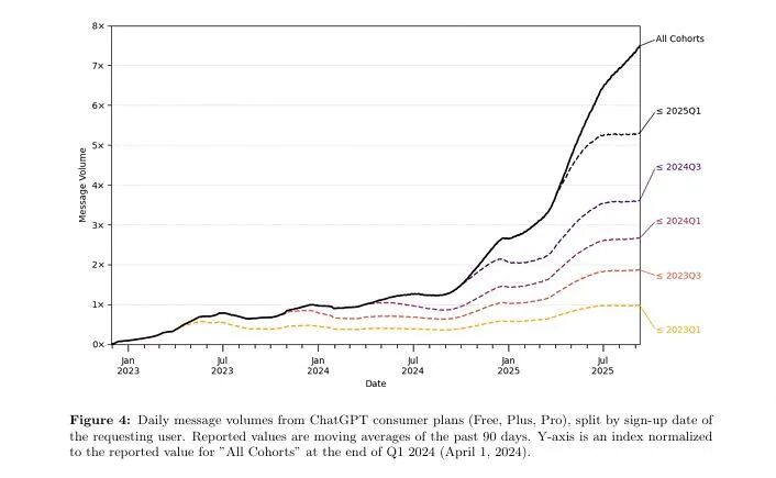 2025年10月,一项由OpenAI、哈佛大学和杜克大学研究人员共同发布的报告显示,ChatGPT的月活跃用户已达7亿,占全球成年人口约10%。