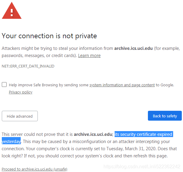 Solution: You have to use another browser OR directly download the data file by left click the "Proceed to archive.ics.uci.edu (unsafe)"