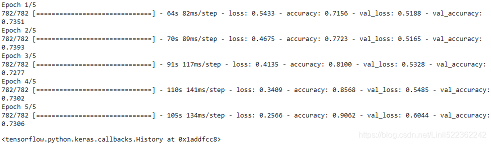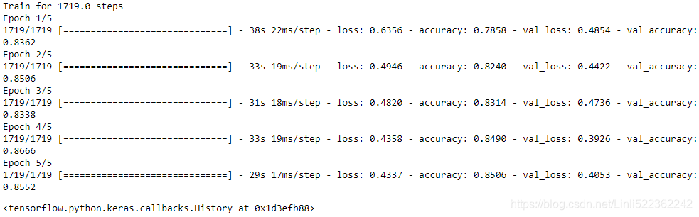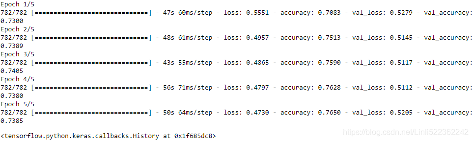 model.compile(loss="binary_crossentropy", optimizer="nadam", metrics=["accuracy"]) model.fit(train_set, epochs=5, validation_data= valid_set)