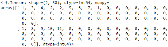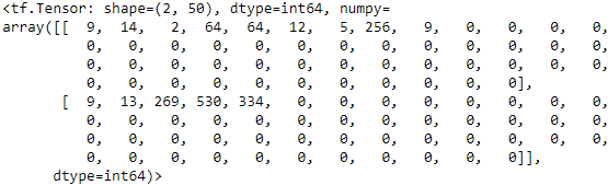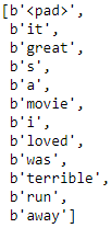 Looks good! As you can see, each review was cleaned up and tokenized, then each word was encoded as its index in the vocabulary (all the 0s correspond to the<pad>tokens)