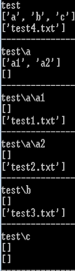 files : Prints out all files from root and directories.# Driver function import os if __name__ == "__main__": for (root,dirs,files) in os.walk('Test', topdown=true): print root print dirs print files print '--------------------------------'