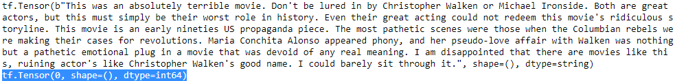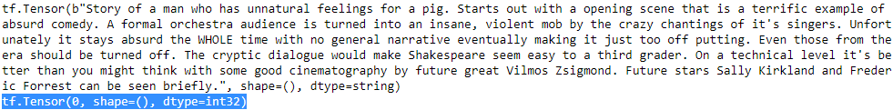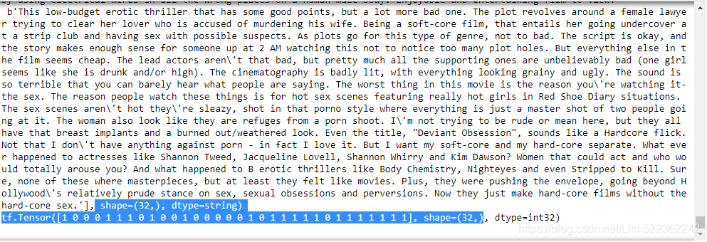 batch_size = 32 train_set = imdb_dataset(train_pos, train_neg).shuffle(25000).batch(batch_size).prefetch(1) valid_set = imdb_dataset(valid_pos, valid_neg).batch(batch_size).prefetch(1) test_set = imdb_dataset(test_pos, test_neg).batch(batch_size).prefetch(1) for X,y in train_set.take(1): print(X)# print(len(X)) # 32 print(y)# print(len(y)) # 32 print()