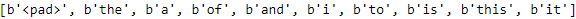 from collections import Counter def get_vocabulary( data_sample, max_size=1000): preprocess_reviews = preprocess(data_sample).numpy() counter = Counter() for words in preprocess_reviews: for word in words: if word != b"<pad>" : counter[word] += 1 return [b"<pad>"] + [word for word, count in counter.most_common(max_size)] get_vocabulary(X_example)