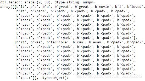 def preprocess(X_batch, n_words=50): shape = tf.shape(X_batch) * tf.constant([1,0]) + tf.constant([0, n_words])# ==> shape(batches, n_words) Z = tf.strings.substr(X_batch, 0, 300) # cropping them to 300 characters # <head.*?> matches only one “<head>” Z = tf.strings.lower(Z) # "\" : An escape character Z = tf.strings.regex_replace(Z, b"<br\\s*/?>", b" ") # "\s": white space, "\S": non-white space OR ([^\s]) Z = tf.strings.regex_replace(Z, b"[^a-z]", b" ") # replace all non-letter characters to spaces Z = tf.strings.split(Z) #splitting the reviews into words return Z.to_tensor(shape=shape, default_value=b"<pad>") X_example = tf.constant(["It's a great, great movie! I loved it.", "It was terrible, run away!!!"]) preprocess(X_example)