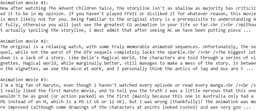 Using the preceding code example, we printed the first 500 characters from the top three Animation movies. The reviews—even though we don't know which exact movie they belong to—sound like reviews of Animation movies .