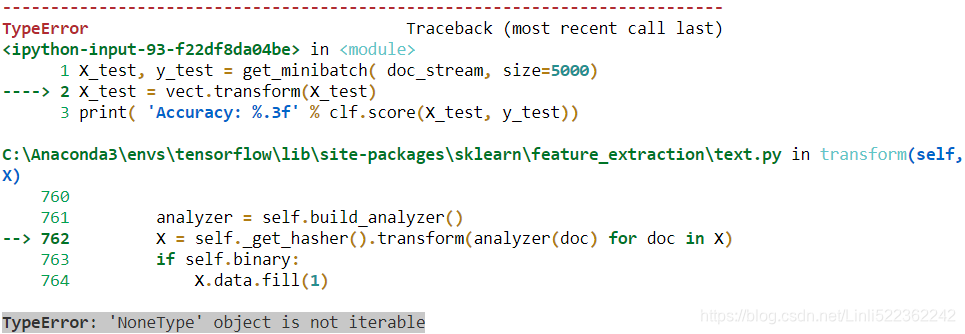 Solution: Please run your code from where you defined HashingVectorizer ( decode_error='ignore', n_features=2**21, preprocessor=None, tokenizer=tokenizer)