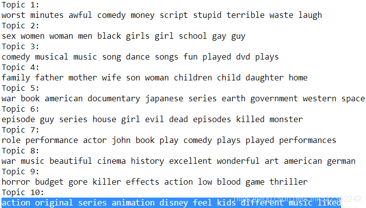 To analyze the results, let's print the five most important words for each of the 10 topics. Note that the word importance values are ranked in increasing order.
