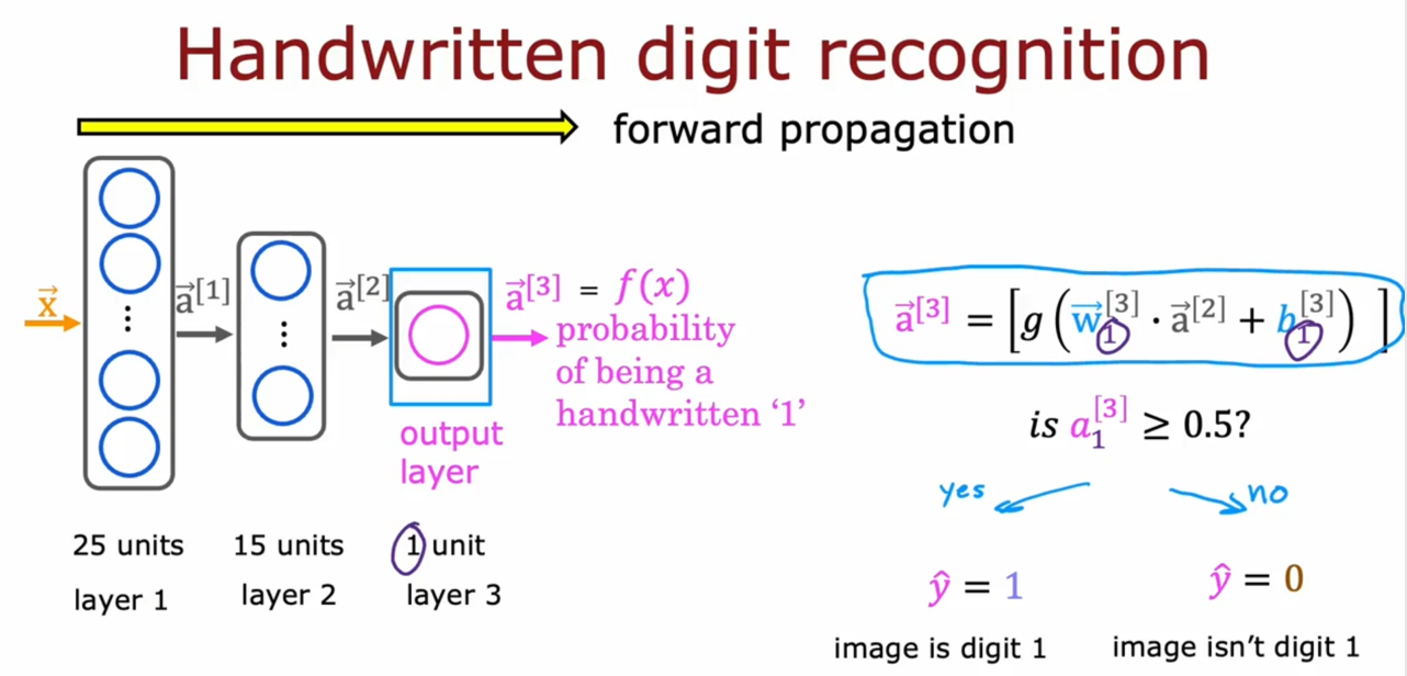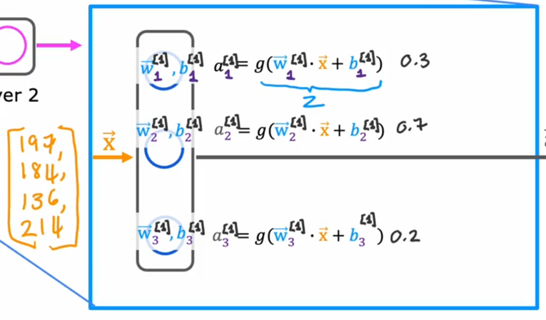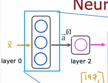 我们将数据输入,在神经元里面进行计算,第一个神经元经过计算输出值,第二个第三个同理,我们可以把每一个神经元看作是一个函数计算,经过计算后,三个神经元的计算结果组成了a向量,传输至下一层,当我们构建多层的神经网络的时候,不同的层将起到不同的作用。输入层一般被称为Layer 0。如今的神经网络一般可以达到几十层甚至上百层。为了区分不同的层,我们一般用上标加上方括号来标记不同的层。