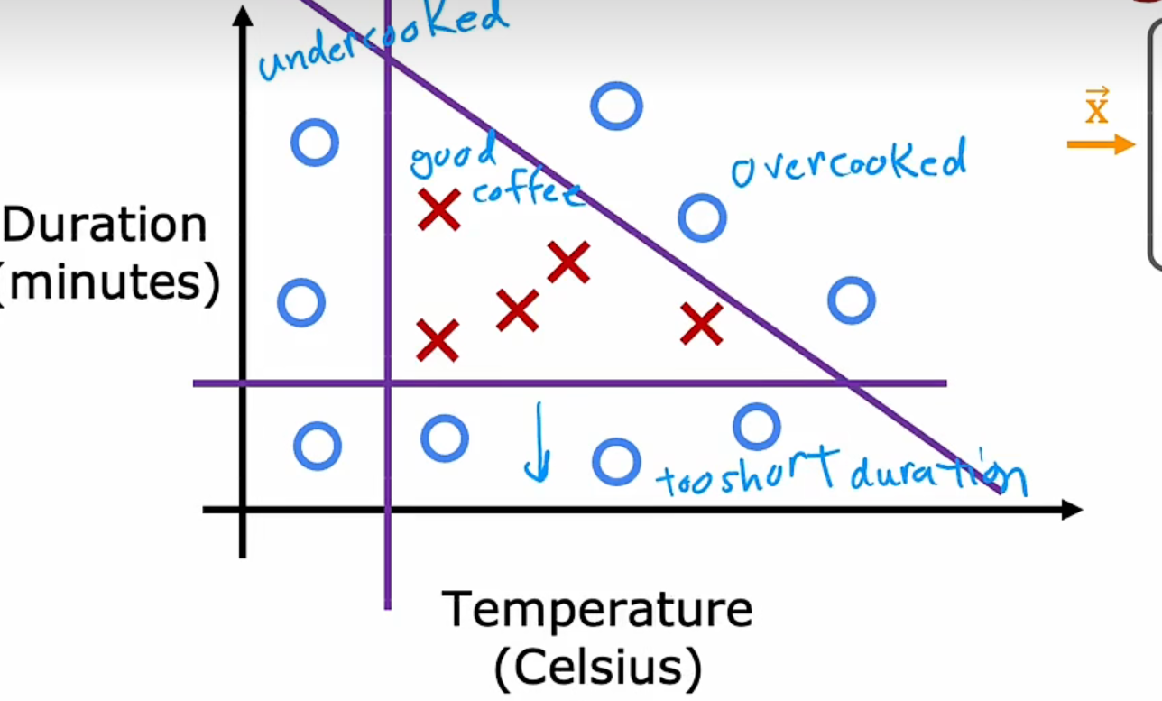 假设我们已经有了一组数据,我们需要神经网络来帮我们推断在这个温度和持续时间下是否能产生好咖啡,这里就需要代码的实现