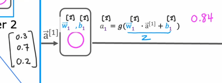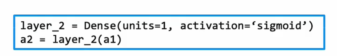 我们首先创建一个x数组用来输入温度和持续时间,第二行的含义是创建一个隐藏层,有三个单元,激活函数采取s型函数,Dense代表着密集层,随着后面不断地学习我们会了解到其他的层,但是这里我们先用密集层。第三行的含义是我们得到的a1便是Layer1经过计算得到的向量。