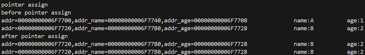 printf("\n\npointer assign\n");