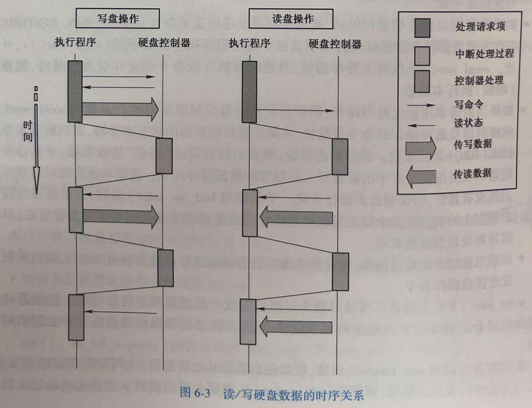 为了能更清晰地看清楚硬盘读写操作的处理过程,我们可以把这些函数、中断处理过程以及硬盘控制器三者之间的执行时序关系用下图表示出来: