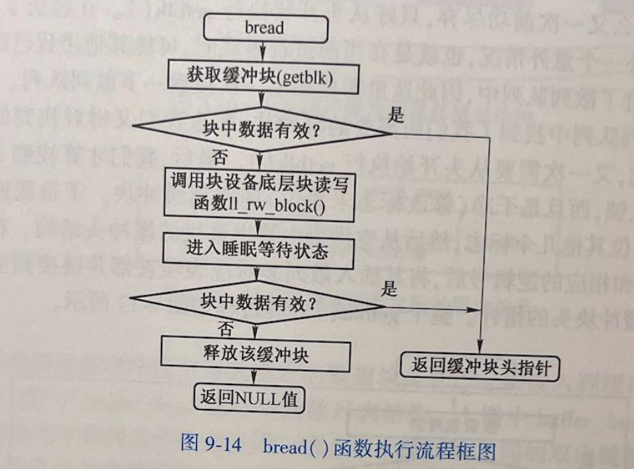 由以上处理可以看到,getblk()返回的缓冲块可能是一个新的空闲块, 也可能正好是含有我们需要数据的缓冲块, 它已经存在于高速缓冲区中。因此对于读取数据块操作(bread()),此时就要判断该缓冲块的更新标志,看看所含数据是否有效,如果有效就可以直接将该数据块返回给申请的程序。否则就需要调用设备的底层块读写函数(1l_rw_block()),并同时让自己进人睡眠状态,等待数据被读入缓冲块。在醒来后再判断数据是否有效,如果有效,就可将此数据返给申请的程序,否则说明对设备的读操作失败了,没有取到数据。于是,释放该缓冲块,并返回 NULL值。