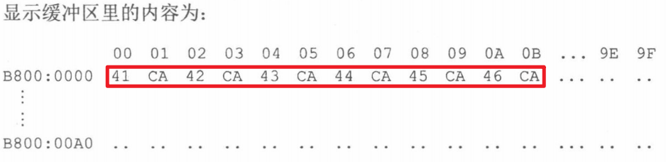 内存地址空间中,B8000H~BFFFFH共32KB的空间,为80×25彩色字符模式的显示缓冲区。向这个地址空间写入数据,写入的内容将立即出现在显示器上。(这就是原理,至于为什么,自己不必问,底层就是做好这样的)。