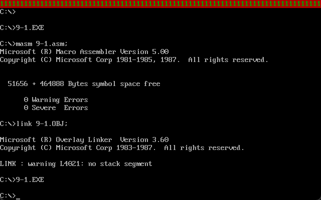 (红底高亮闪烁绿色,属性字节为:11001010B,CAH)