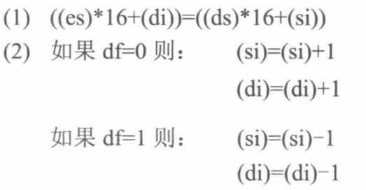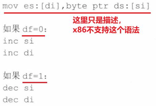 可以看出,movsb的功能是将ds:si指向的内存单元中的字节送入es:di中,然后根据标志寄存器df位的值,将si和di 递增或递减。