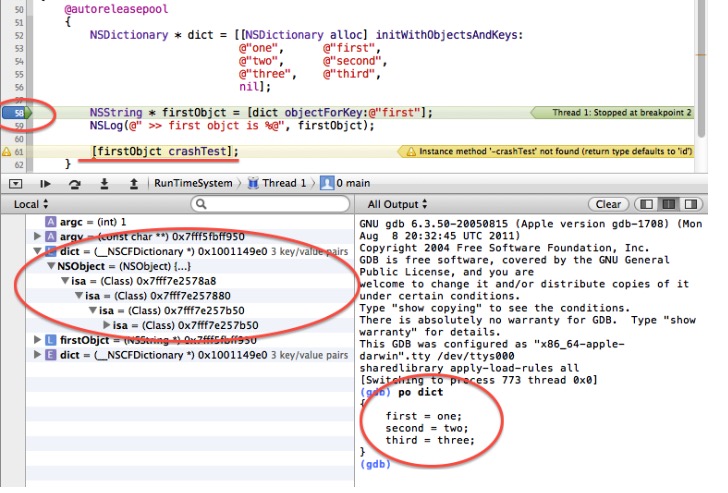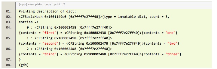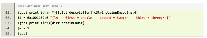 上图中,我使用 po 命令显示一个 NSDictionary 的内容。注意在左侧我们可以看到 dict 的一些信息:3 key/value pairs,显示该 dict 包含的数据量,而展开的信息显示 isa 层次体系(即class 和 metaclass结构关系)。我们可以右击左侧的 dict,选中“Print Description of "dict"”,则可以在控制台输出 dict 的详细信息: