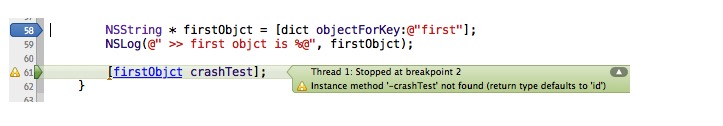 有时候我们的程序不知道跑到哪个地方就 crash 了,而 crash 又很难重现。保守的做法是在系统抛出异常之前设置断点,具体来说是在 objc_exception_throw处设置断点。设置步骤为:首先在 XCode 按 CMD + 6,进入断点管理窗口;然后点击右下方的 +,增加新的 Symbolic Breakpoint,在 Symbol 一栏输入:objc_exception_throw,然后点击 done,完成。 这样在 Debug 模式下,如果程序即将抛出异常,就能在抛出异常处中断了。比如在前面的代码中,我让 [firstObjctcrashTest]; 抛出异常。在 objc_exception_throw 处设置断点之后,程序就能在该代码处中断了,我们从而知道代码在什么地方出问题了。