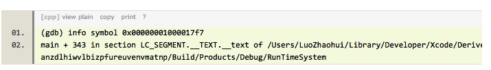 比如 "info symbol 内存地址" 可以获取内存地址所在的 symbol 相关信息: