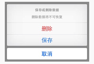 UIAlertController *alertController = [UIAlertController alertControllerWithTitle:@"保存或删除数据" message:@"删除数据将不可恢复" preferredStyle: UIAlertControllerStyleActionSheet]; |