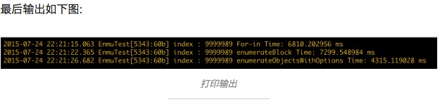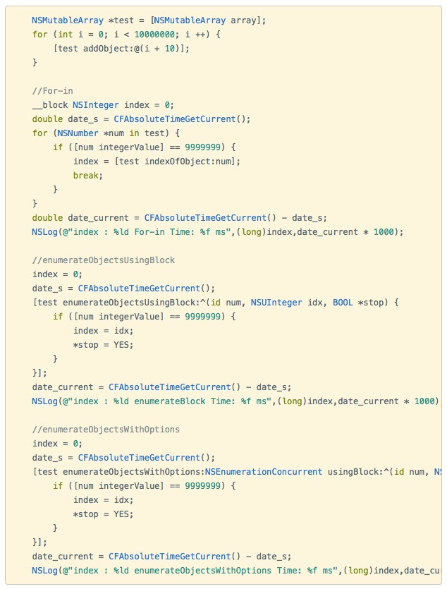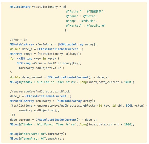 这里我们比较一下使用 For-in 和 enumerateKeysAndObjectsUsingBlock 这个两个方法:
