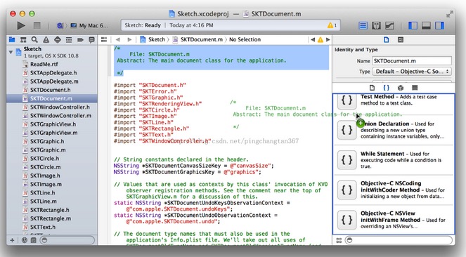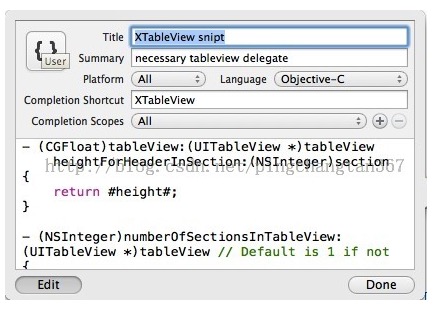 tableview是我们经常使用的控件,而使用tableview控件需要自己去实现一些基本的tableview的代理。这些对于每个程序基本上都是大同小异。对于声明property来说也是我们经常需要做的工作。所以我们需要把这些公用的东西总结成代码块,供我们以后的快捷使用.