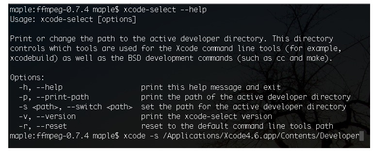 注:由于FFmpeg库比较陈旧,该脚本使用xcode4.6下,编译器为GCC,采用6.1的SDK进行编译。如果你的机器上装的同事安装了xcode4.x和xcode5的话,可以在命令行下使用如下命令切换当前的默认编译环境为xcode4.6即可: