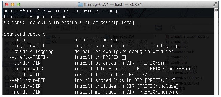 提示位置选项--disable-iconv,根据提示我们输入./configure查看所有可用选项。命令行下切换到实际的FFmpeg源码目录下,查看帮助如下图: