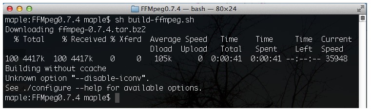 通过第三部分的介绍,相信我们应该对FFmpeg的配置都有了一个初步的认识,我们再回到第三部分开始时我们运行build-ffmpeg.sh的碰到的问题,经过查看configure的帮助,我们发现0.7这个版本的FFmpeg库却是没有"--disable-iconv"选项。这个牛逼的脚本是针对当前较新的FFmpeg库写的,在低版本中没有一些配置选项也是正常。
