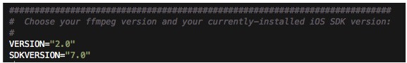 2) build-ffmpeg.sh脚本中可以配置编译的FFMpeg版本,以及使用iOS SDK的版本,如下图所示: