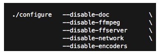 我们知道FFmpeg库是一个非常庞大的库,包括编码,解码以及流媒体的支持等,如果不做裁剪全部编译进来的话,最后生成的静态库会很大。实际使用中我们可能只想用到解码(例如播放器),因此我们可以使用相关选项指定编译时禁用编码部分。当然我们还可以做进一步的裁剪,例如只打开部分常用格式的解码,禁用掉其他的解码,这样编译出来的静态库将会更小。
