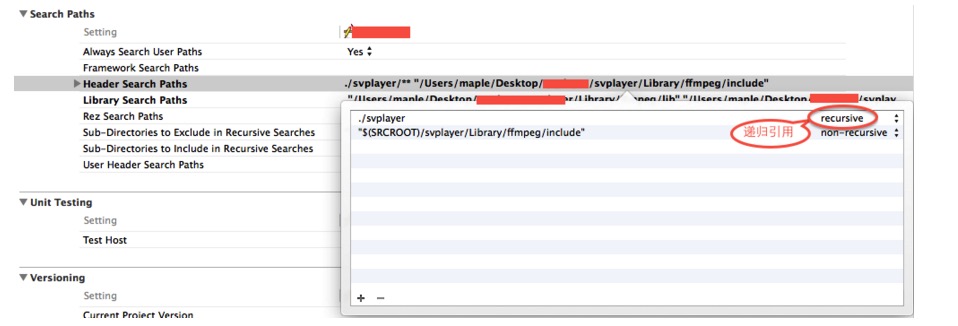 我们知道一般静态库都是搭配头文件使用的,要在项目里面使用FFmpeg库,我们出了需要在xcode的build phases中添加静态库以外,还需要导入该库对应的头文件。FFmpeg库对应的头文件有很多,通常会采用设置header search path的方式来导入头文件,这样做有两个好处: 第一可以避免对我们的工程结构造成干扰。第二可以在一定程序上降低头文件冲突。