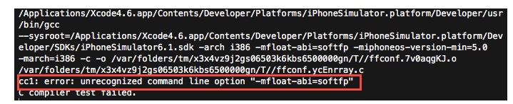 xcode5下面编译FFmpeg都采用clang,同样也会遇到类似问题。这个问题通常出现在配置文件错误的情况下,一般都是gcc路径错误,当然也可能是其他编译参数错误问题。