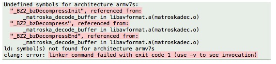 如果导入FFmpeg库了,并且配置了头文件搜索路径,遇到"Undefined symbols for architecture armv7s: _BZ2_bzDecompressInit",如下图所示: