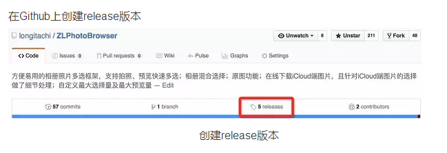 框架上传后,避免不了版本的更新,更新版本也简单,上传最新的代码,在github上创建新的release版本(再次提醒注意版本号与podspec文件的s.version保持一致),然后再次执行命令即可: