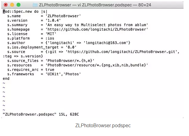 我的ZLPhotoBrowser.podspec文件如下,涉及到更多的CocoaPods命令,请自行搜索
