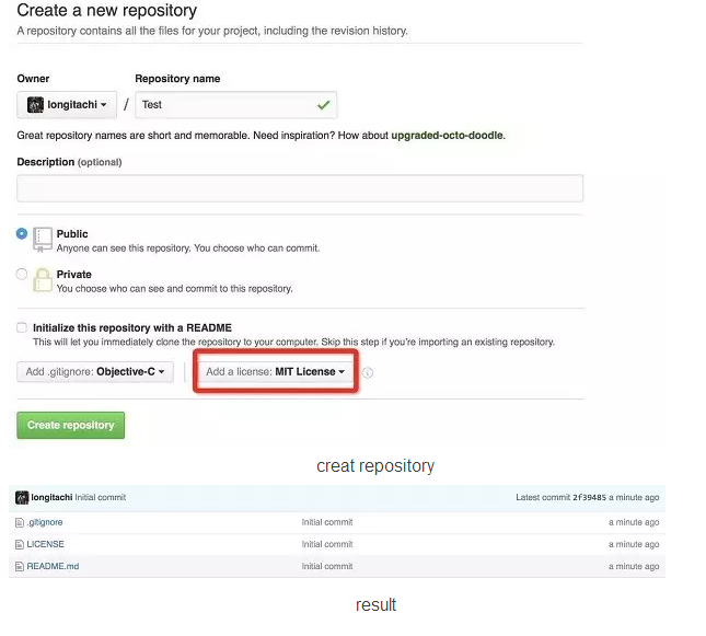 我们还可以观察到,支持CocoaPods的代码下载下来之后,都会有*.podspec、LICENSE和.gitignore(该文件为隐藏文件),那么先说LICENSE和.gitignore文件,这个可以再github上创建工作目录时候便勾选出来,如下图: