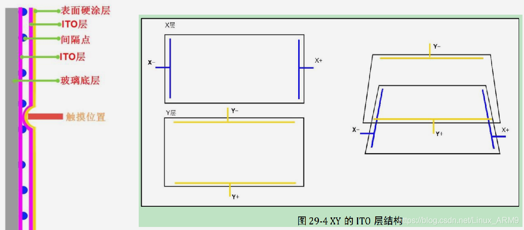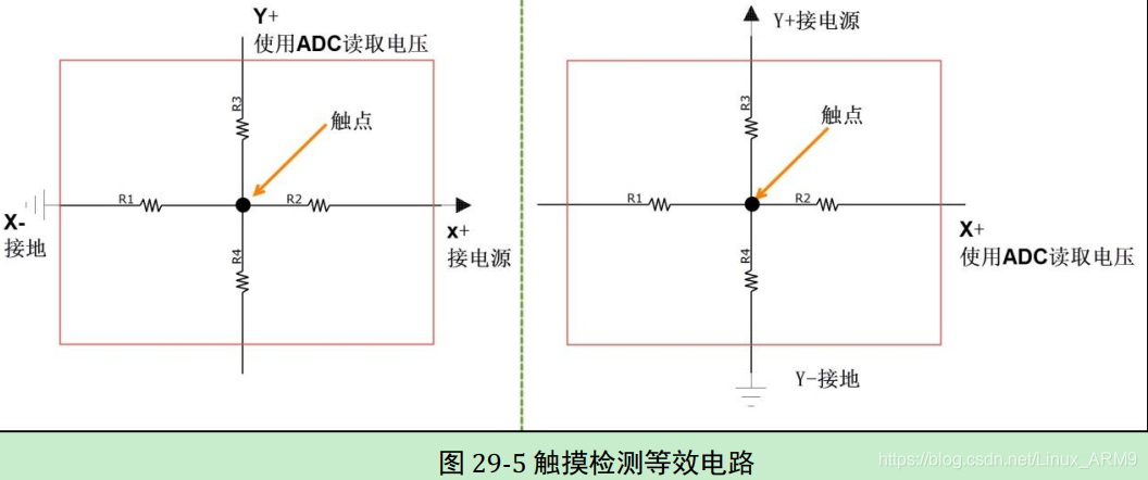 - 当触摸屏按下时,XY的IOT层相互接触(类似于薄膜键盘,按键按下,触点将上面两面导通,从而检测键盘位置),从触点处把ITO层分为两个电阻,由于均匀导电的关系,两个电阻的大小与触点离两电极的距离成比例关系,利用这个特性; 可通过下述过程来检测坐标;
