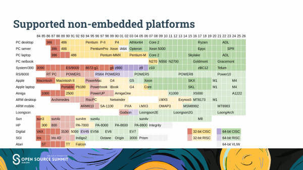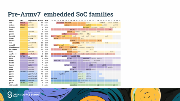 许多其他 pre-armv7 CPU 已经停产,但内核仍对其提供支持。他说,其中大约有十种现在就可以移除支持。能够说对其他处理器的支持将在固定期限(比如十年)后移除会很好,但硬件支持并非如此运作。相反,人们必须从“半衰期”的角度来思考;每隔一段时间,就有可能移除对一半平台的支持。这一切都取决于相关处理器是否有用户。