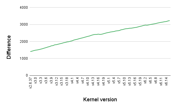 因此,有了这些工具,就可以分析内核究竟有多少种配置方式。内核中配置参数数量的增长大致呈线性,导致内核可配置方式的数量呈指数级增长。以下图表显示了两条趋势线:蓝线是内核实际配置方式数量的对数,红线是配置选项的数量(经过适当缩放以适应同一坐标轴;详见下文)。红线代表蓝线可能达到的理论最大值。直接绘制 6,000 位数字对于 LibreOffice Calc 和 Google Sheets 来说都太困难了,因此采用了对数表示。