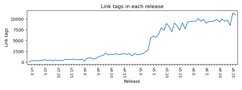Link 标签并非新事物;它首次出现在内核仓库中是在这个 2011 年的提交中。该提交以及其他 56 个包含 Link 标签的提交,都被纳入了 2.6.39 版本。最初,此标签主要用于 x86 和核心内核子系统(core-kernel subsystems)的提交,每个版本中约有 300 到 500 个提交使用。如下图所示,Link 标签的使用量随时间缓慢增长,直到发生了某些事情: