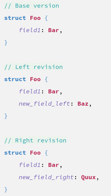 尽管如此,对于某些语言的编辑,Mergiraf 甚至可以利用特定语言知识来解决此类冲突。例如,考虑对 Rust 结构体的以下更改: