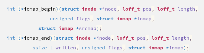 不深入细节,iomap_begin() 请求文件系统为给定 inode 在从 pos 开始的 length 字节范围内指定磁盘上的映射。当内核完成映射后,它将通过调用 iomap_end() 通知文件系统。在此期间,内核很可能会使用该映射在内存和文件系统的存储设备之间移动数据。