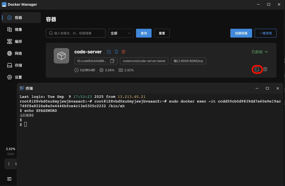 若忘记密码,可在Docker Manager中点击容器终端,输入echo $PASSWORD 查看Code Server的密码